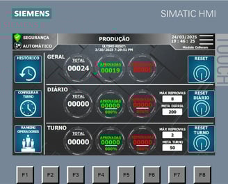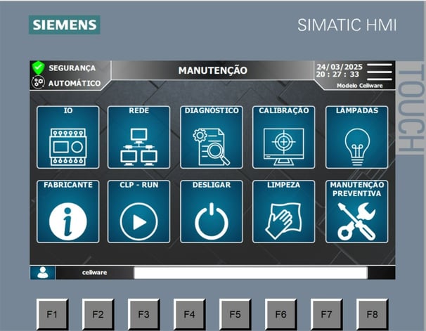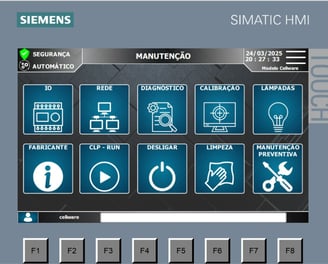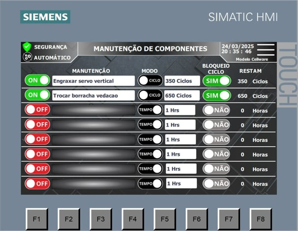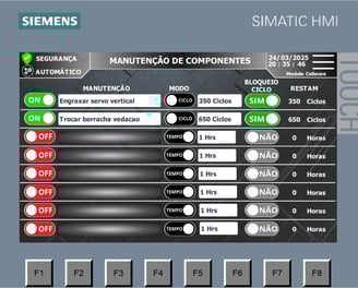 O Padrão de software Siemens permite a configuração de manutenções preventivas, que podem ser ativas por ciclo ou tempo e podem ou não bloquear o ciclo de produção da máquina.