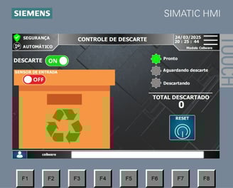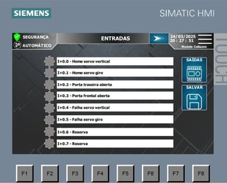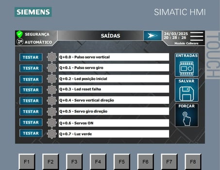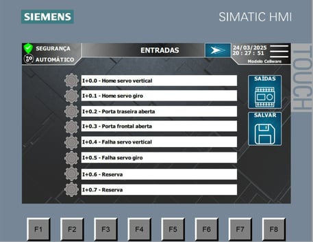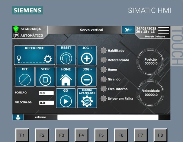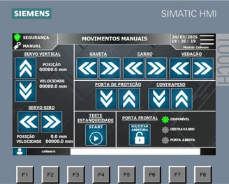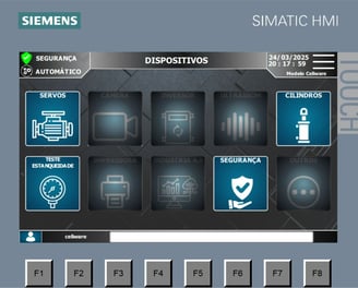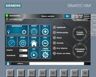Nesta interface, o operador pode visualizar e interagir com elementos como servomotores, inversores, cilindros pneumáticos e outros.