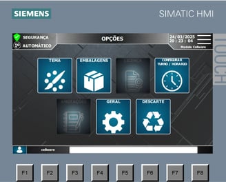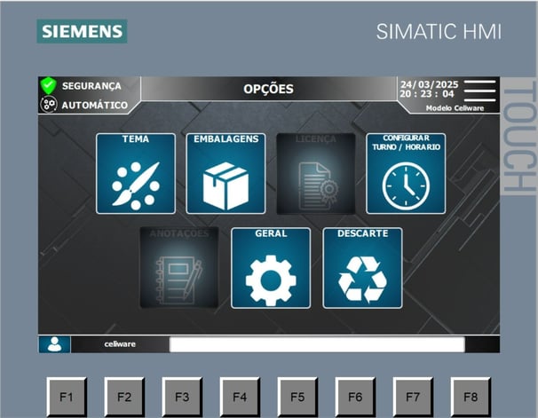 O padrão oferece diversas opções que permitem ajustes rápidos e intuitivos no sistema, como mudança de tema, configuração de embalagens, turnos, descarte, consulta de licença e anotações.