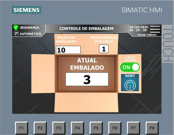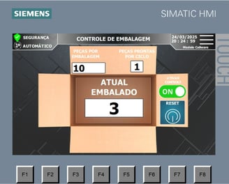 A área de gerenciamento de embalagens permite a configuração da quantidade de peças por embalagem, monitorar o progresso em tempo real e ativar ou resetar o controle com facilidade, otimizando o processo logístico.