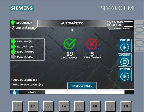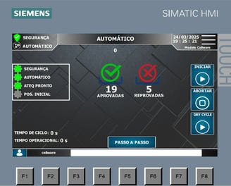 Execute, controle e manipule os ciclos com apenas alguns toques. Na tela de automático do padrão de software Siemens você consegue observar as condições para início de ciclo e o resultado do ciclo que foi executado, bem como realizar ações como iniciar / parar o ciclo, executar um ciclo em modo passo a passo ou executar ciclos em loop.