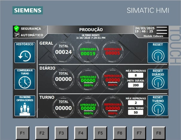 A tela de produção exibe os totais de peças gerais, diárias e por turno, separando as quantidades aprovadas e reprovadas com porcentagem.