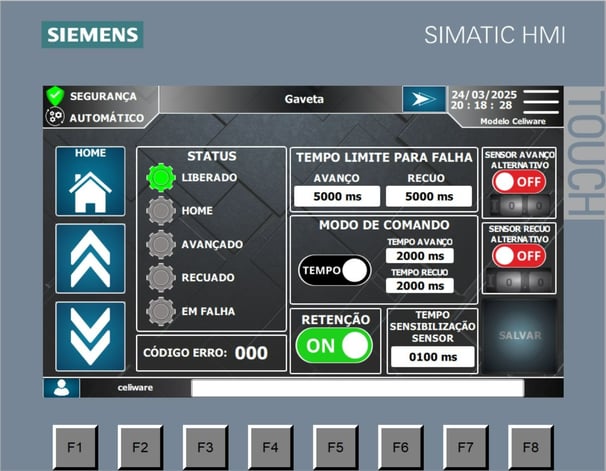 Com esta tela, você ajusta tempos de avanço e recuo, define modos de comando, ativa sensores alternativos e monitora o status de funcionamento em tempo real.