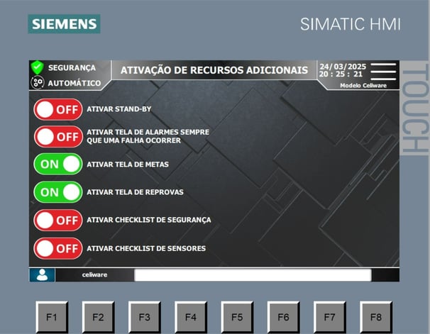 Com um simples toque, é possível ativar ou desativar funções como standby, metas, reprovas, alarmes e checklists, tornando a interface mais flexível e adaptável ao dia a dia da fábrica.