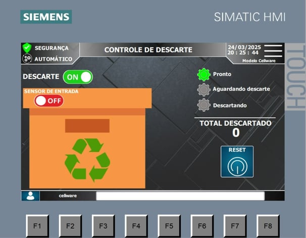 O administrador pode ativar ou desativar o sistema de descarte, verificar o status atual e visualizar o total descartado. Tudo isso de forma simples, garantindo rastreabilidade e organização na produção.